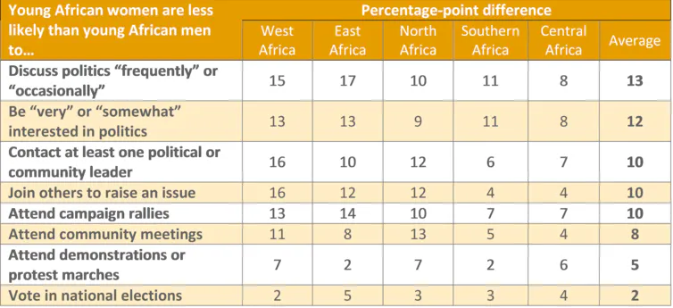 The youth charter requires its signatories to eliminate laws and practices that are discriminatory toward girls and women. The objective here is to ensure equal access to all spheres of society. But, young women consistently report lower levels of political engagement than their male peers. This is particularly so in West African and East African countries.