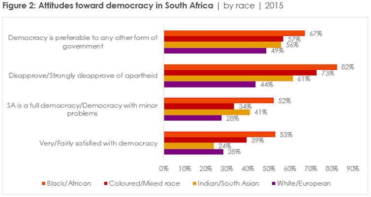 Only half (49%) of white citizens prefer democracy, while even fewer believe that the country is a democracy and are satisfied with its current implementation. Both stand at 28%. Furthermore, only a minority (44%) say that they would disapprove of returning to apartheid rule. Nearly a third (30%) would approve of such an initiative and 23% were ambivalent.