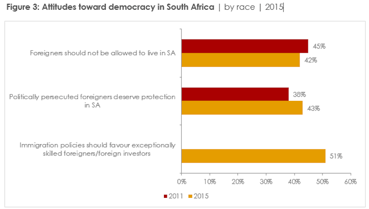 Attitudes toward immigrants from neighbouring countries makes South Africa one of the most intolerant countries surveyed. Views towards highly skilled workers and foreign investment are somewhat more welcoming.