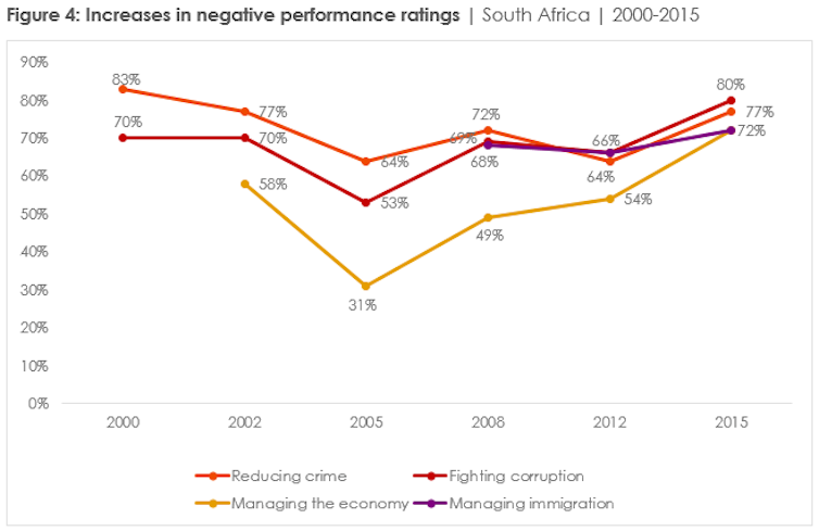 The proportion of citizens who say the government is doing “badly” or “very badly” in this area has increased. This is despite the fact that tighter immigration regulations were introduced in 2014 to “better manage immigration in a way that balances South Africa’s openness to travellers as well as developmental and security imperatives.”