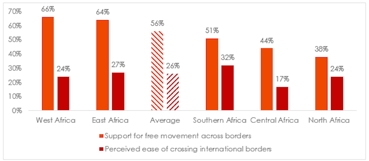 Nevertheless only minorities of citizens in West and East Africa believe it is easy to cross borders to work or trade. The gap between public support for free movement and perceptions of ease of travel is lowest in North Africa (14 percentage points). It is followed by Southern Africa (19 points).