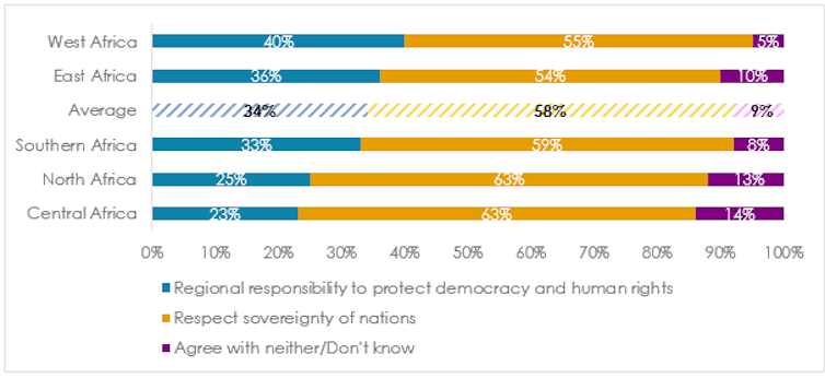 Afrobarometer data also indicate significant challenges to political integration. A majority of citizens in all five regions support respect for national sovereignty (58%, on average). But when it comes to regional responsibility to guarantee free elections and prevent human rights abuses in other countries, support falls to 34%. Preferences vary widely by country, with support for regional responsibility highest in Burkina Faso.