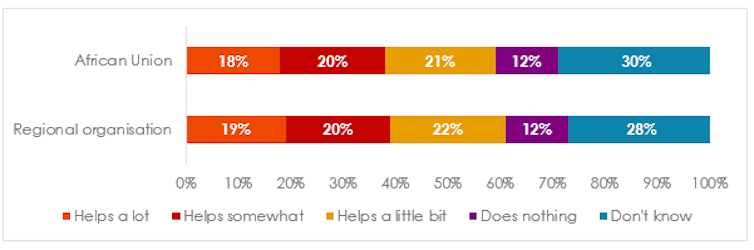 This suggests that national support for cooperative and integrative agreements can affect public opinion. Still, a significant proportion of African citizens don’t know enough about the institutions promoting integration. This affects their ability to rate their helpfulness to their own countries.